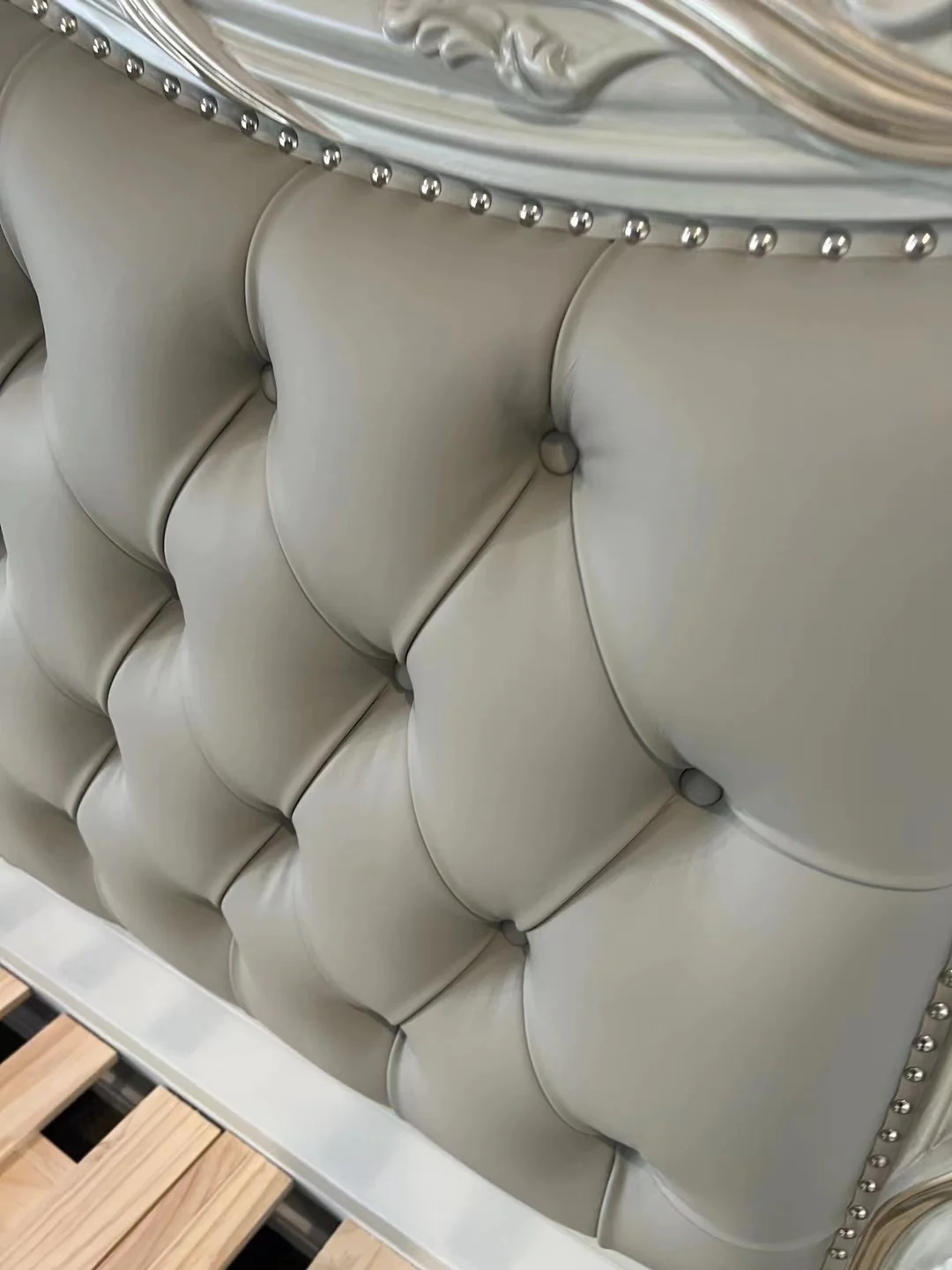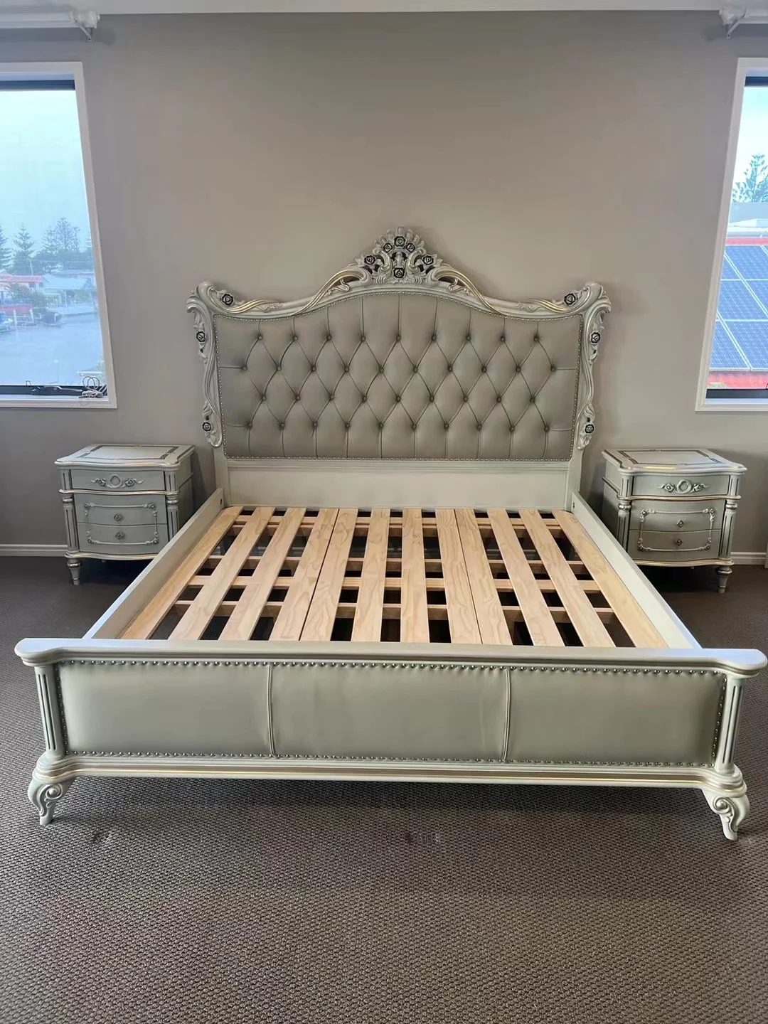 The Ariane French Bed is a luxury bed that makes an exquisite centrepiece in any bedroom. The handcrafted light grey frame is paired with a medium grey leather headboard and footboard featuring extensive ornaments in gold and silver accent. Subtle curves complement the towering wingback headboard with tufted buttons, which evokes a distinctly majestic feel. Available in King size only.