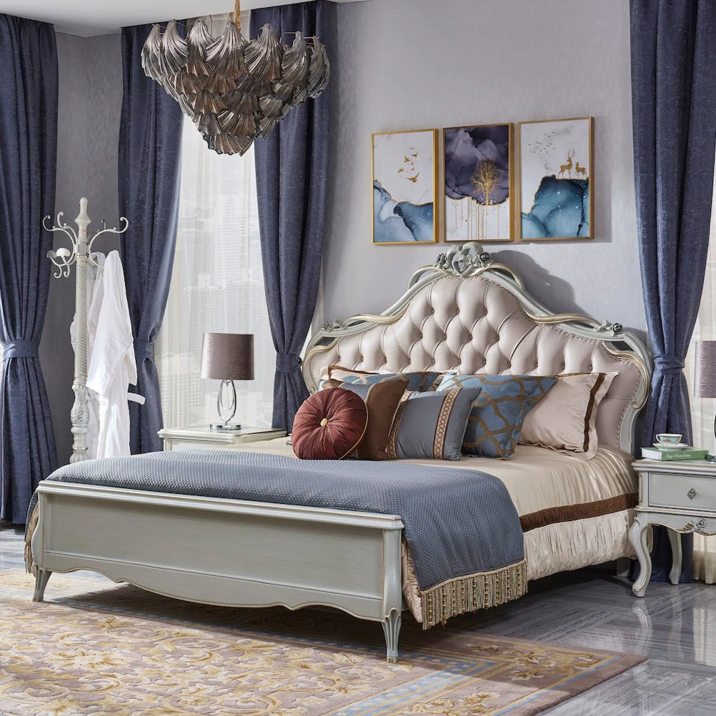 The Claudette French Bed is a luxury bed that makes an exquisite centrepiece in any bedroom. The handcrafted light grey frame is paired with a cream leather headboard featuring extensive ornaments in gold and silver accent. Subtle curves complement the headboard with tufted buttons and heart-shaped ornaments, which evoke a distinctly majestic feel. Available in King size only