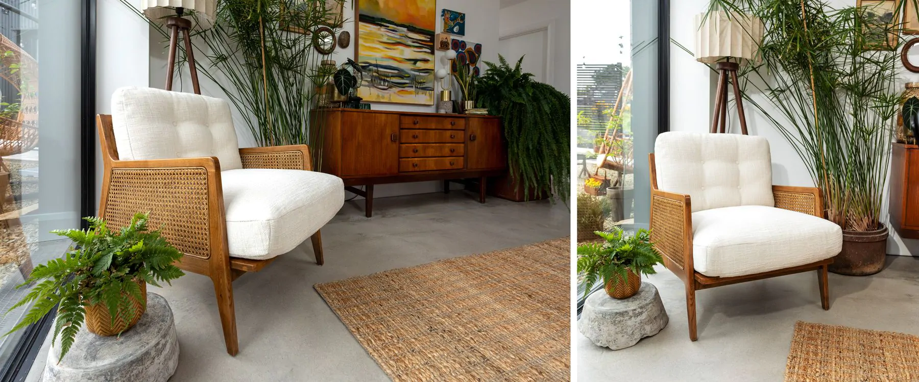 What truly sets the Logan Cream Crosshatch Chair apart is its unique armrests. Made with a natural rattan guise, the cage design creates a delicate yet sturdy framework that contrives the chair’s overall aesthetic. The cream-colored fabric is perfectly complemented by the natural rattan armrests, creating a harmonious blend of materials that is both striking and sophisticated