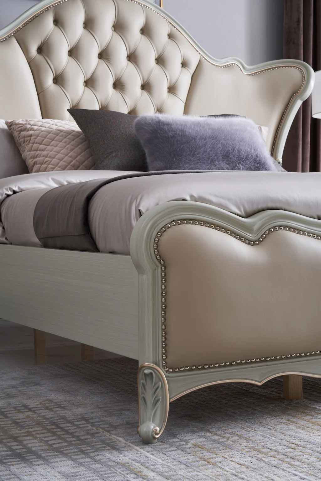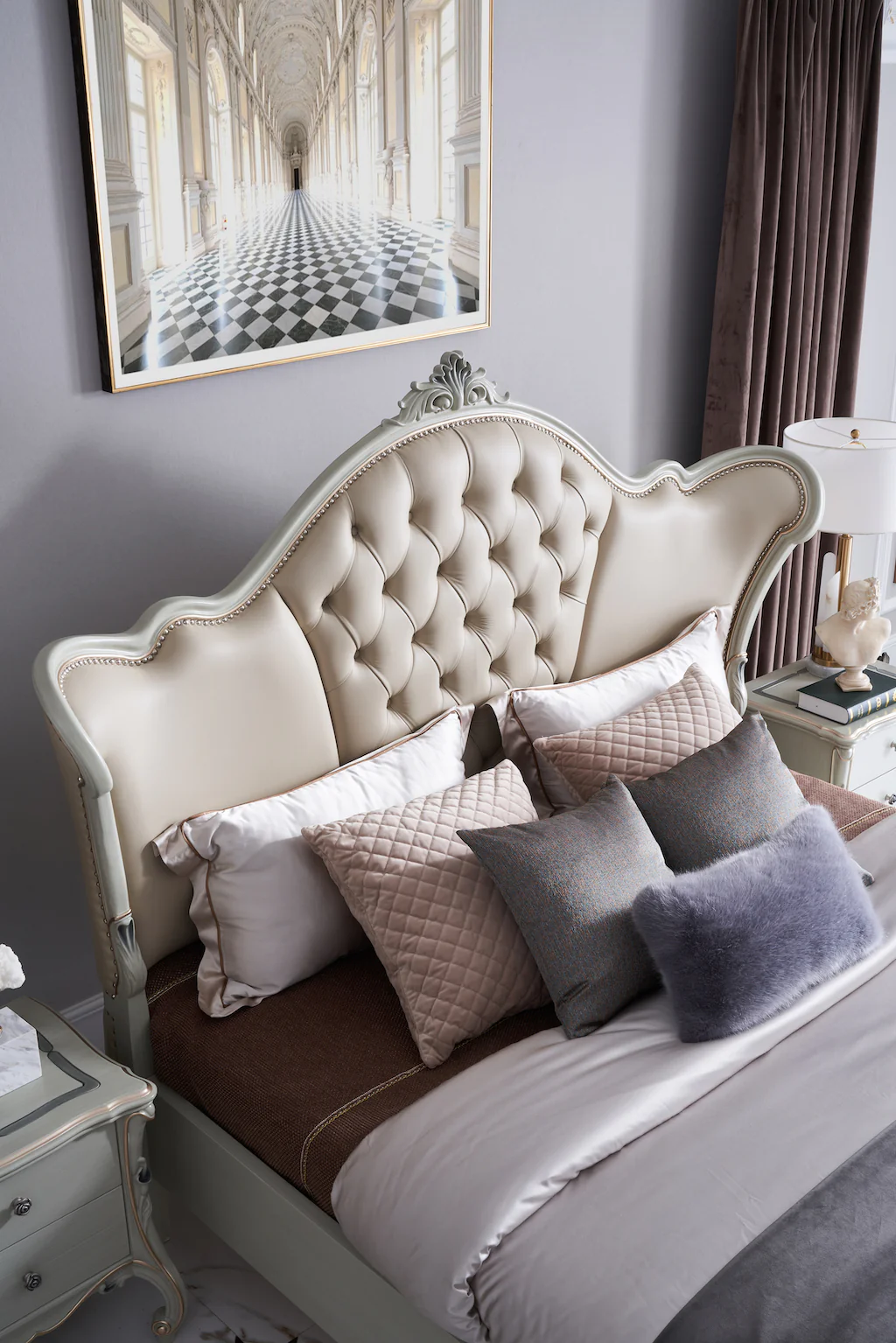 The Odette French Bed is a luxury bed that makes an exquisite centrepiece in any bedroom. The handcrafted light grey frame is paired with a beige leather headboard and footboard, both with tufted buttons. Featuring exaggerated curves and intricate ornaments in gold accent, the towering wingback headboard of this luxury bed evokes a distinctly majestic feel. Pair with the Antoinette Bedside Table (sold separately) for a spectacular combination. Available in King Size only.