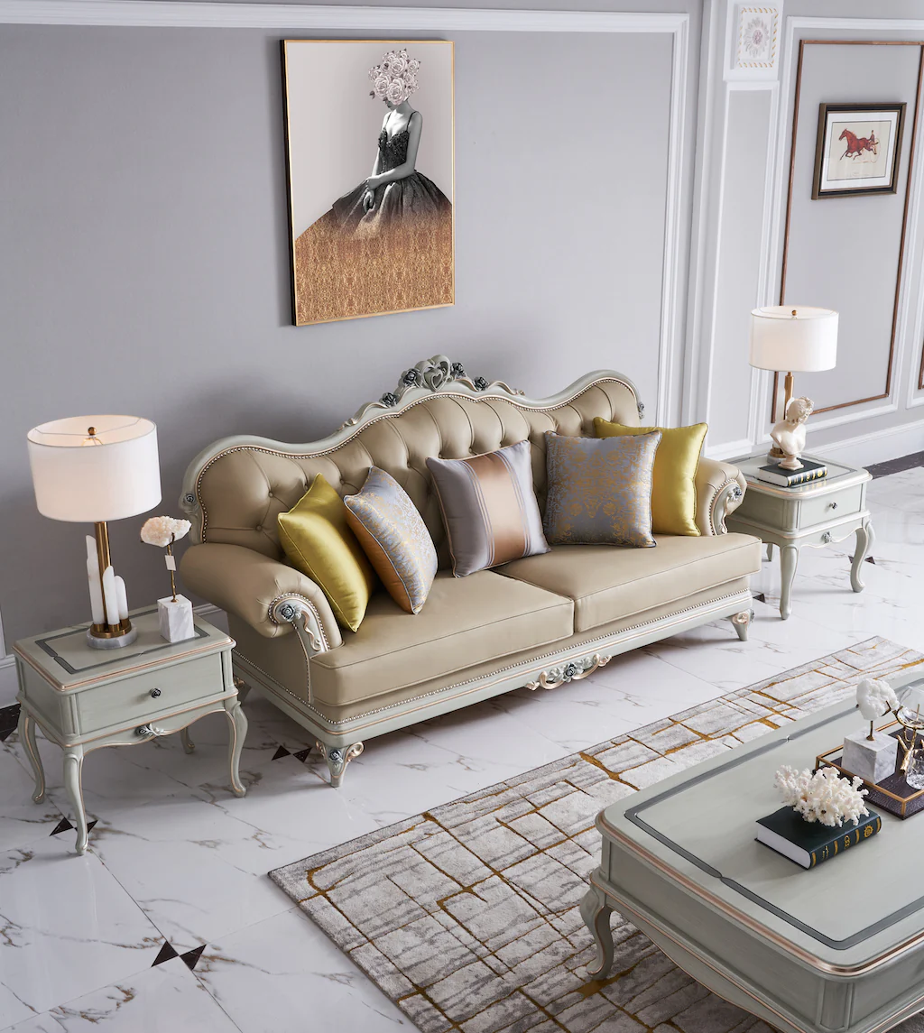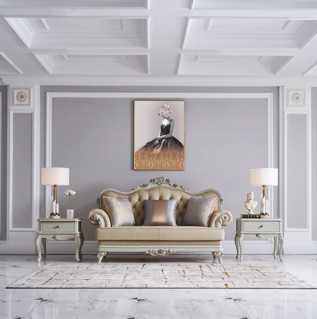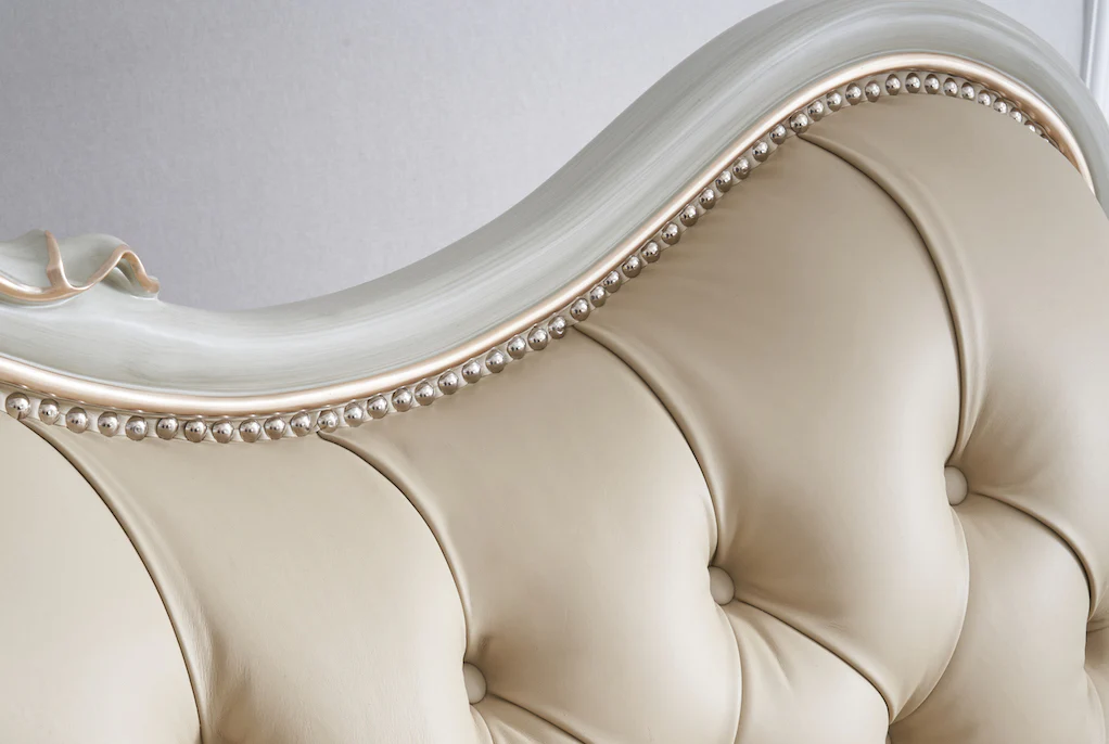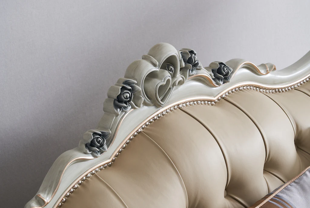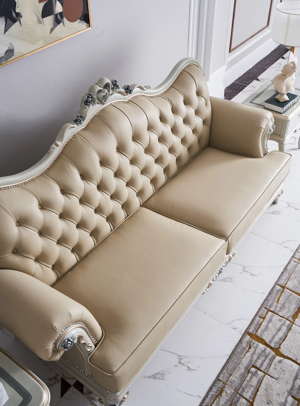 The Pauline French Sofa makes an exquisite centrepiece in any living room. The handcrafted light grey frame is paired with jasmine leather padding and tufted buttons. Featuring exaggerated curves and intricate ornaments, the towering wingback evokes a distinctly majestic feel. Pair with the Pauline Coffee Table (sold separately) for a spectacular combination. Available in three sizes.